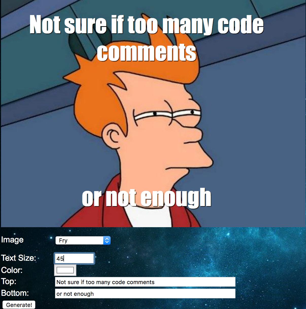 A meme generator using HTML, JavaScript, PHP, and MySQL.