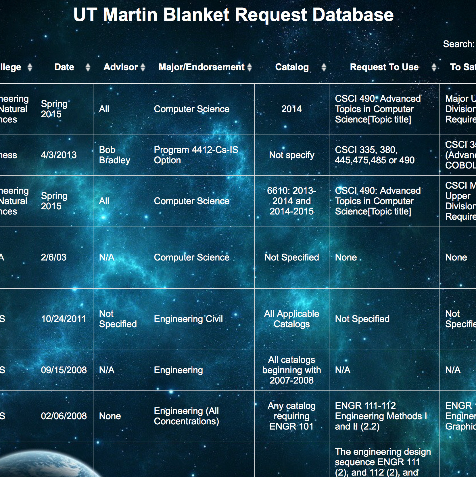 A web portal for accessing PDFs of blanket class replacement requests at UT Martin.